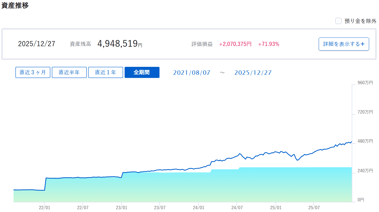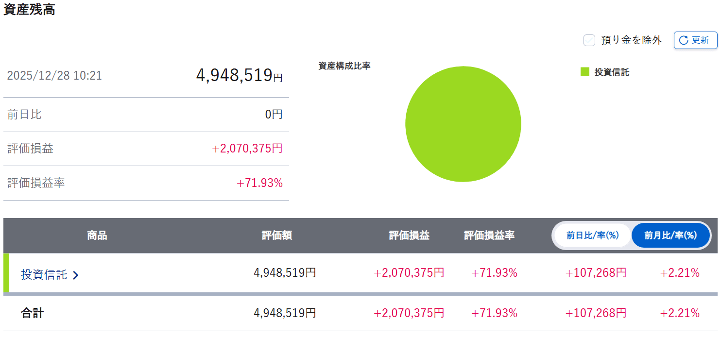 全世界株式インデックスを保有しているだけですが、資産は右肩上がりで、着実に立ち上がってきています。