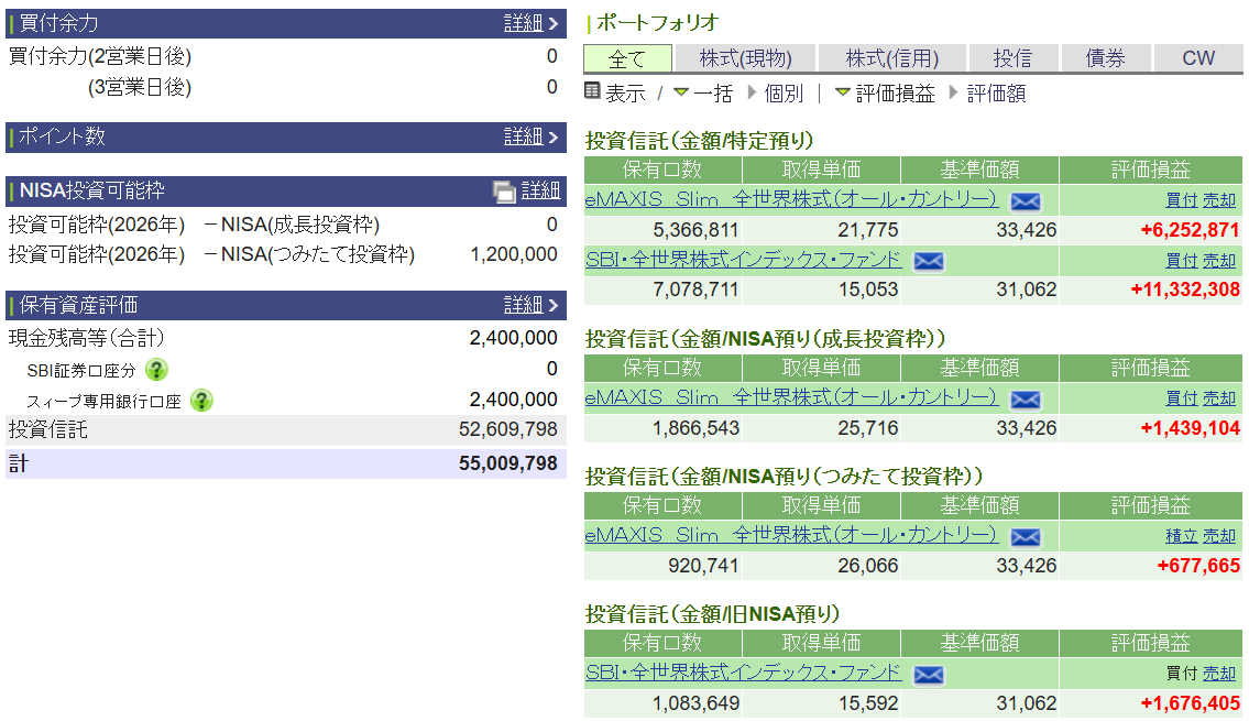 あわせて、2026年のNISA非課税枠のうち、成長投資枠240万円については一括買付の注文を済ませています。2026年の積立投資枠120万円については、引き続き毎月10万円のクレカ積立を継続します。
