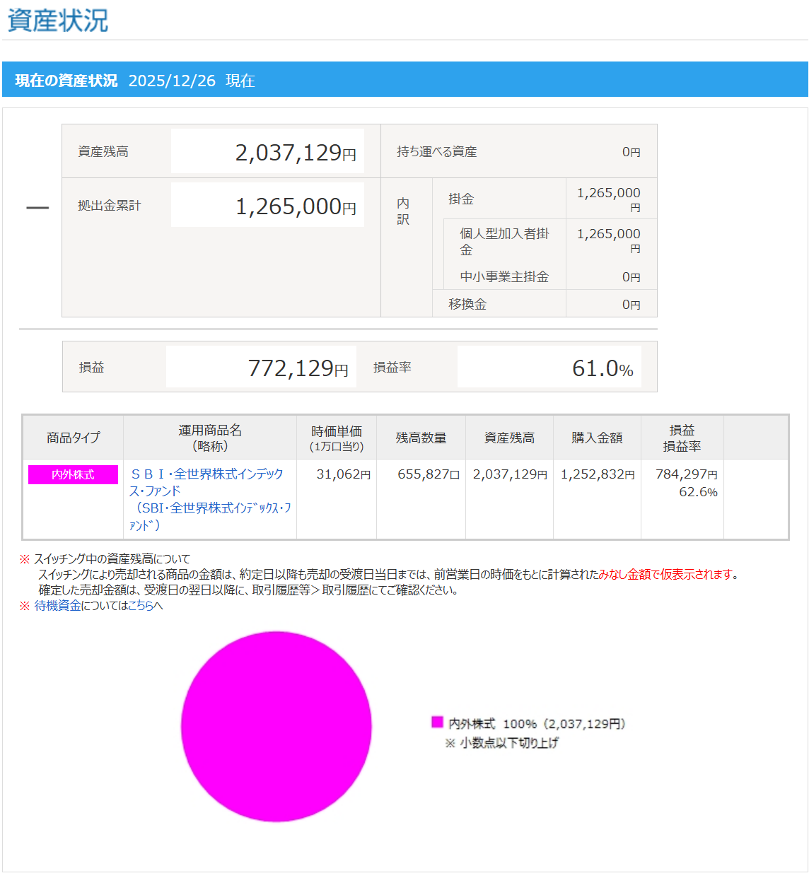 毎月23,000円を淡々と積み立ててきただけですが、着実に育ってきたと感じています。2027年からは、拠出金額を月62,000円に引き上げることを検討しています。